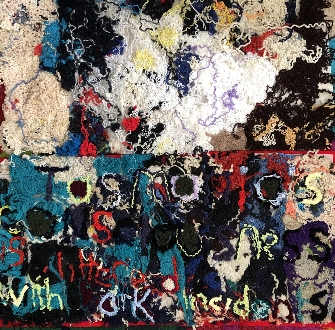 Elizabeth Day, Tasmania’s unconscious is littered with dark incidents, 2020, unravelled opportunity shop garments on muslin backing, 210 x 200 cm. This work is part of a new Unravelling of Form series and from the Working in the Trouble body of work.