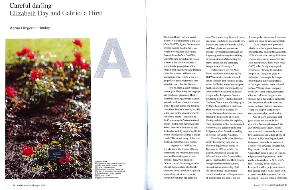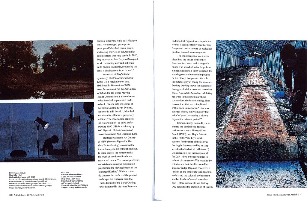 Aarna Fitzgerald Hanley, Careful darling: Elizabeth Day and Gabriella Hirst, feature in Artlink (“In Public / Inside” edited by Daniel Mudie Cunningham), Issue 41:2 | August 2021.