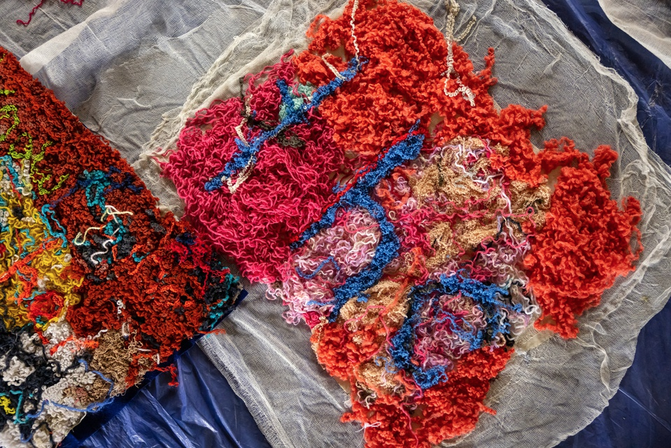 Image above: Elizabeth Day, The Flow of Form: There’s a Reason Beyond a Reason. Beyond That There’s a Reason (1797 Parramatta Gaol), Carriageworks, Redfern, (process image) 2023, unravelled op-shop garments, muslin, 2600 x 650 x 5 cm irregular. Image courtesy and © the artist. Photograph: Jacquie Manning. On display at Carriageworks, 2023.