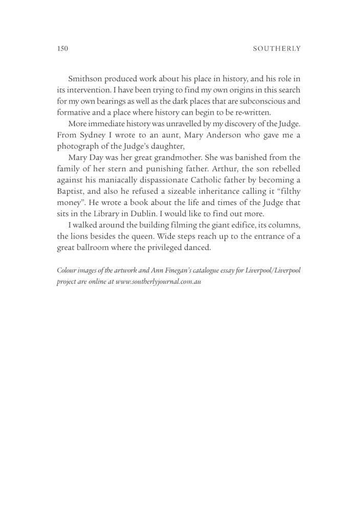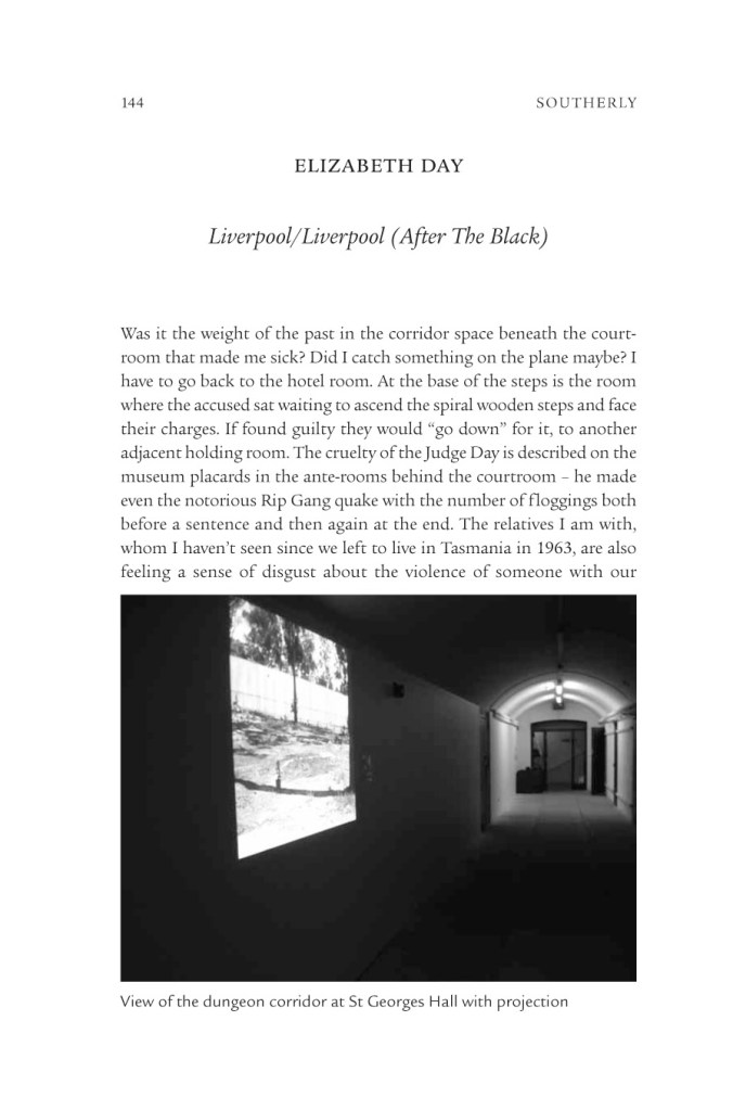 LIVERPOOL/LIVERPOOL (AFTER THE BLACK) See also: Exhibition documentation Liverpool / Liverpool, 2010, Casula Powerhouse Arts Centre, Liverpool (NSW) and St. George’s Hall, Liverpool Biennial, Liverpool (UK). Ann Finegan, Liverpool/Liverpool: The Skin of Translation, 2011, article. Exhibition documentation, The Law is Not Always Just, 2011, Conny Dietzschold Gallery. southerly71-1-2011_elizabethday-1Download