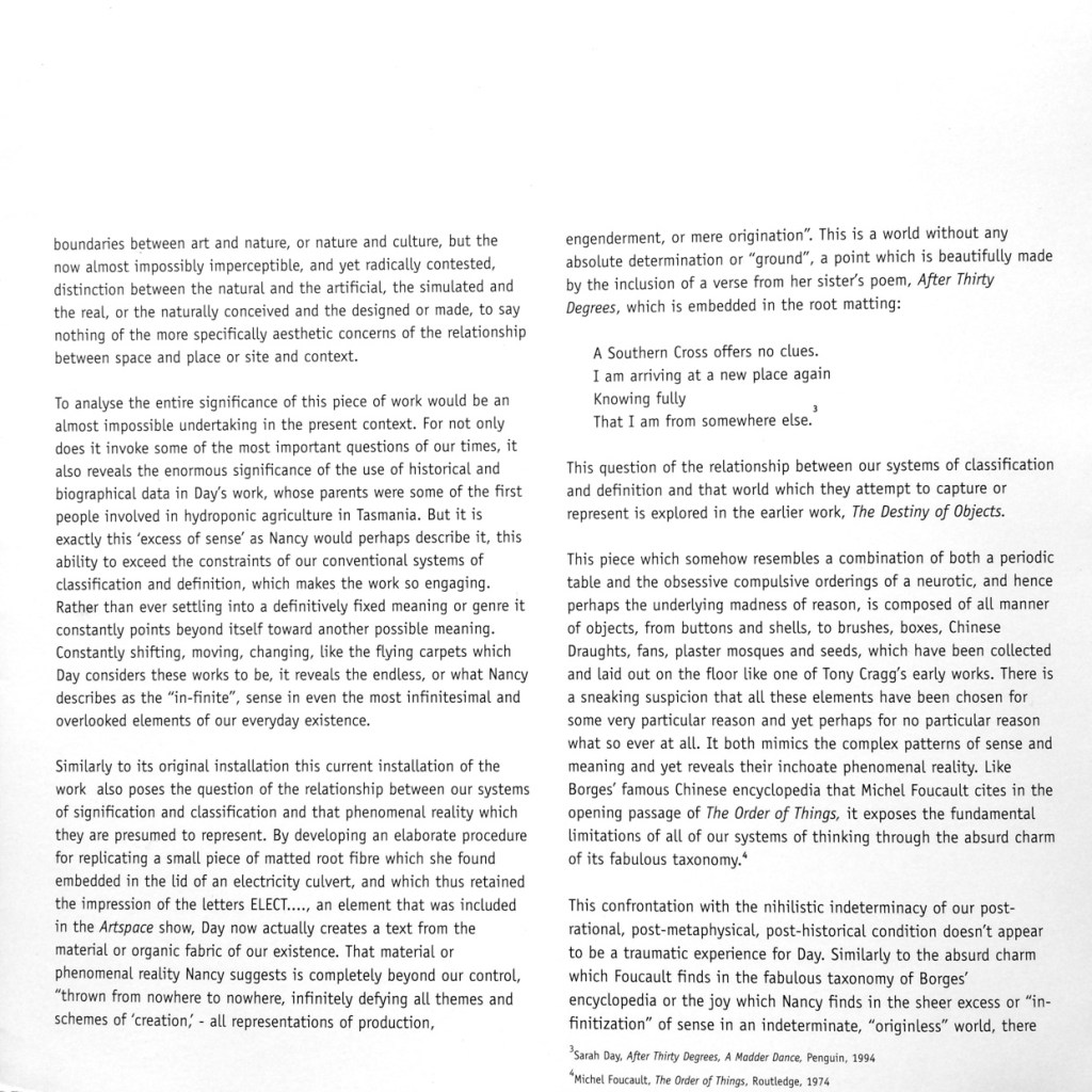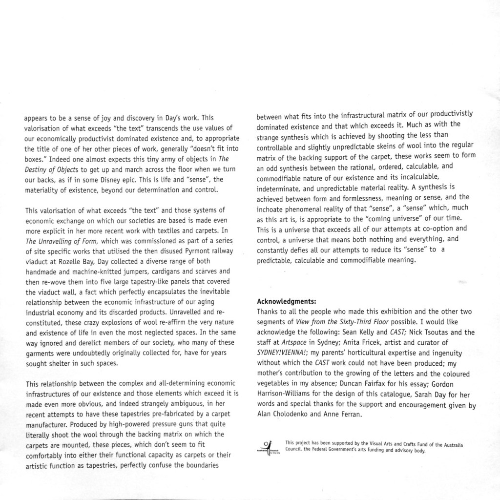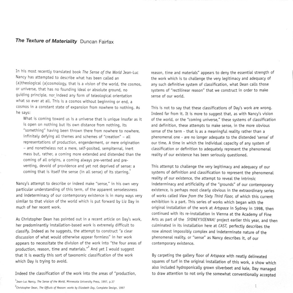 Duncan Fairfax, The Texture of Materiality, in ‘View from the Sixty-Third Floor: An installation in three locations’, exhibition catalogue.