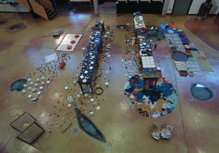 This image was produced for Casula Powerhouse in 1995. The image is of a market with objects bought at local shopping centres and markets. Mixed objects on market tables and on Judy Watson’s floor. MORE…
