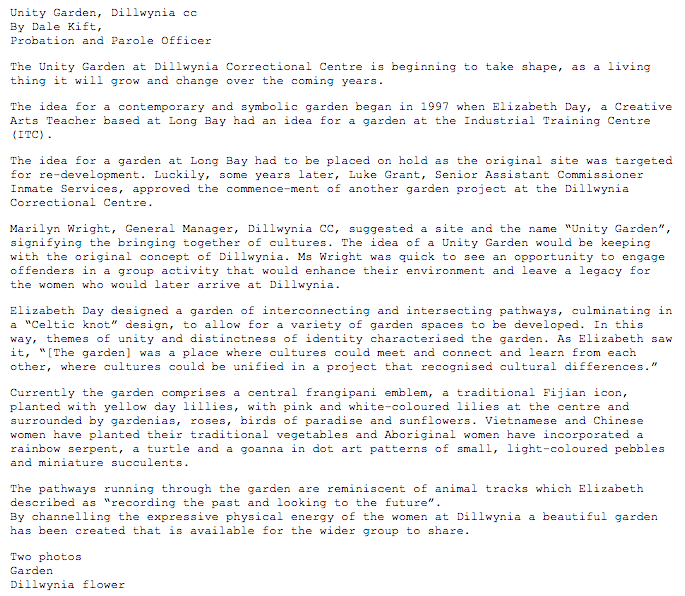 The Dillwynia Garden Project (Boronia Garden or Unity Garden) is a project I facilitated in my role as a teacher working across Creative Arts, Horticulture and Aboriginal Studies courses at Dillwynia Women’s Correctional Centre, NSW, between 2002 and 2007.