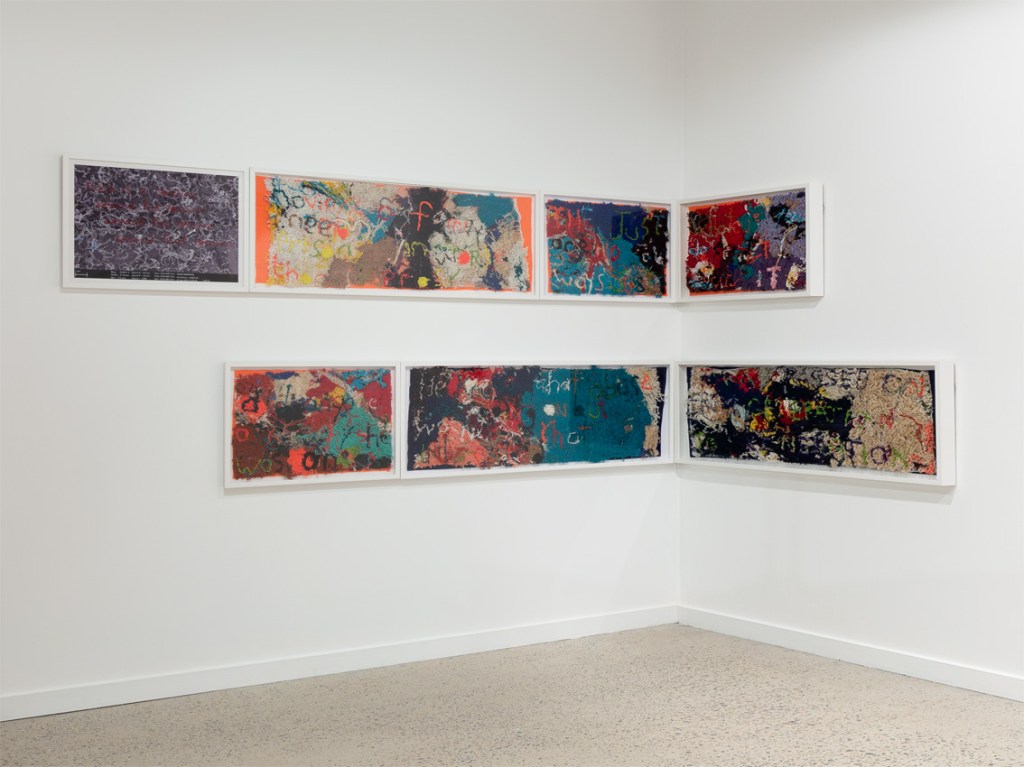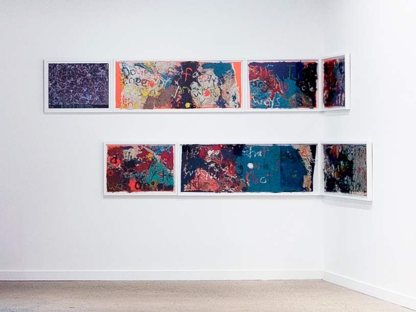 Top row, left to right: 1. There was a reason beyond the reason beyond the reason beyond that reason (53 x 72 cm); 2. Having a family member in prison is worse than leprosy (53 x 122 cm); 3. The just are not always just (53 x 72 cm). 4. Whatever you do don’t talk about it (53 x 72 cm). Bottom row, left to right: 5. Did anyone ask her why she was angry? (53 x 72 cm) 6. He knew that abuse was going on but wasn’t that interested (53 x 130 cm); 7. It was passed on from generation to generation (53 x 130 cm).