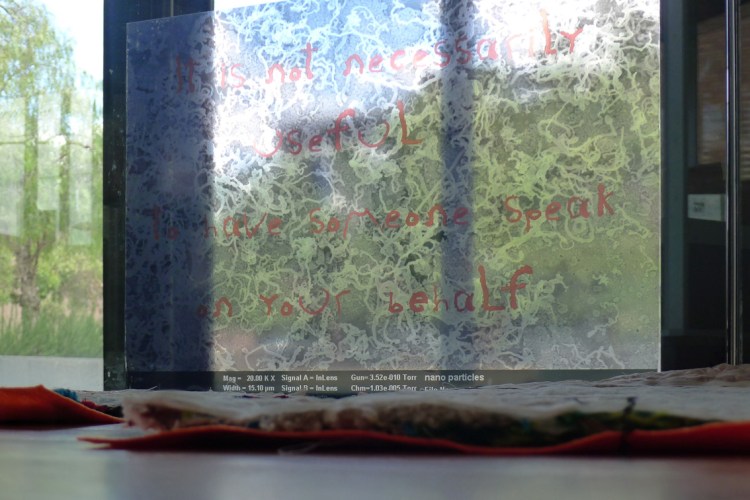 Elizabeth Day, Invisible Words Invisible Worlds: It is not necessarily useful to have someone speak on your behalf, 2016-2017, adhesive vinyl transparency of altered electron microscopy imagery mounted to glass balustrade of floating platform in closed section of the Heritage Courtyard Pavilion. Image: Claire Taylor/GREYSPACE.