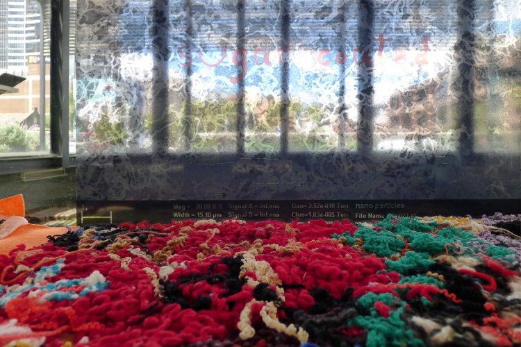 Elizabeth Day, Invisible Words Invisible Worlds: The truth is better sugar coated / Whatever you do don’t talk about it, 2016-2017, installation view, detail, unravelled wool, muslin, felt (dimensions variable), and adhesive vinyl transparency (45 x 60 cm) of altered electron microscopy imagery mounted to glass balustrade of floating platform in closed section of the Heritage Courtyard Pavilion. Image: Claire Taylor/GREYSPACE.