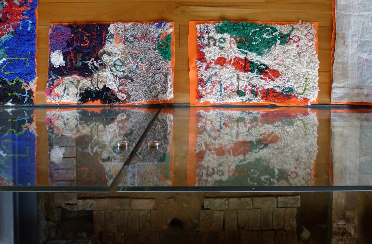 Elizabeth Day, Invisible Words Invisible Worlds: He knew that abuse was going on but wasn’t that interested / It is not necessarily useful to have someone speak on your behalf, 2016-2017, installation view/detail, unravelled wool, muslin, felt, and adhesive vinyl transparency. Footings of the former Colonial Hospital visible. Image: Claire Taylor/GREYSPACE.