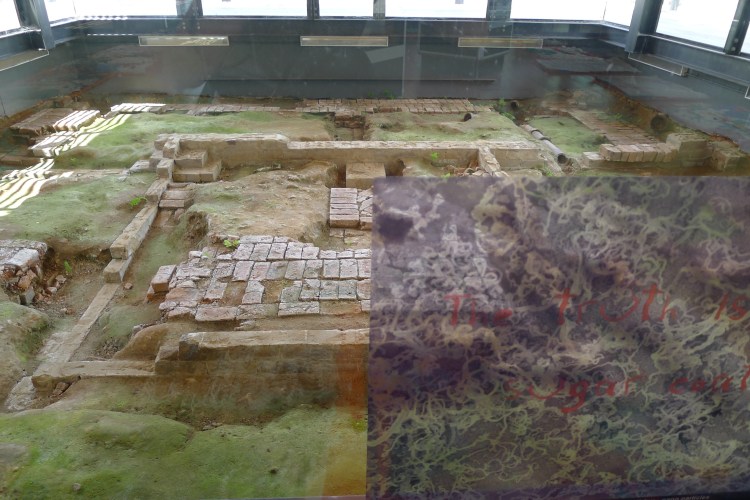 Elizabeth Day, Invisible Words Invisible Worlds, 2016-2017, installation view, unravelled wool, muslin, felt (dimensions variable), and adhesive vinyl transparency (45 x 60 cm). Footings of the former Colonial Hospital visible. Image: Claire Taylor/GREYSPACE.
