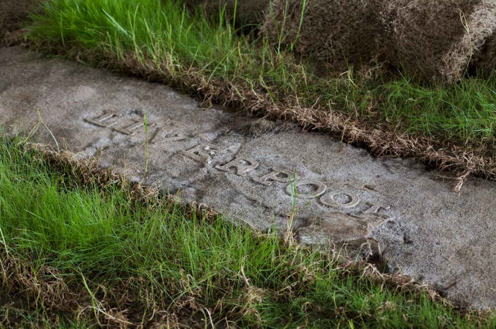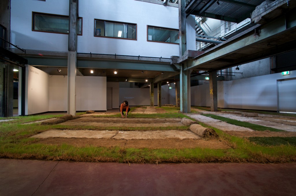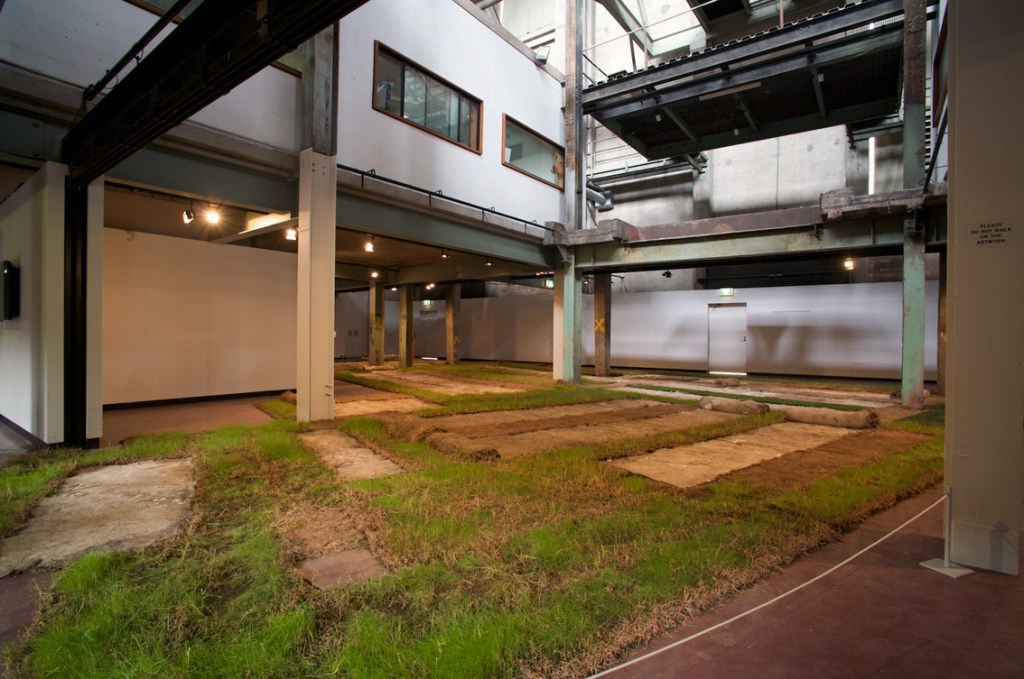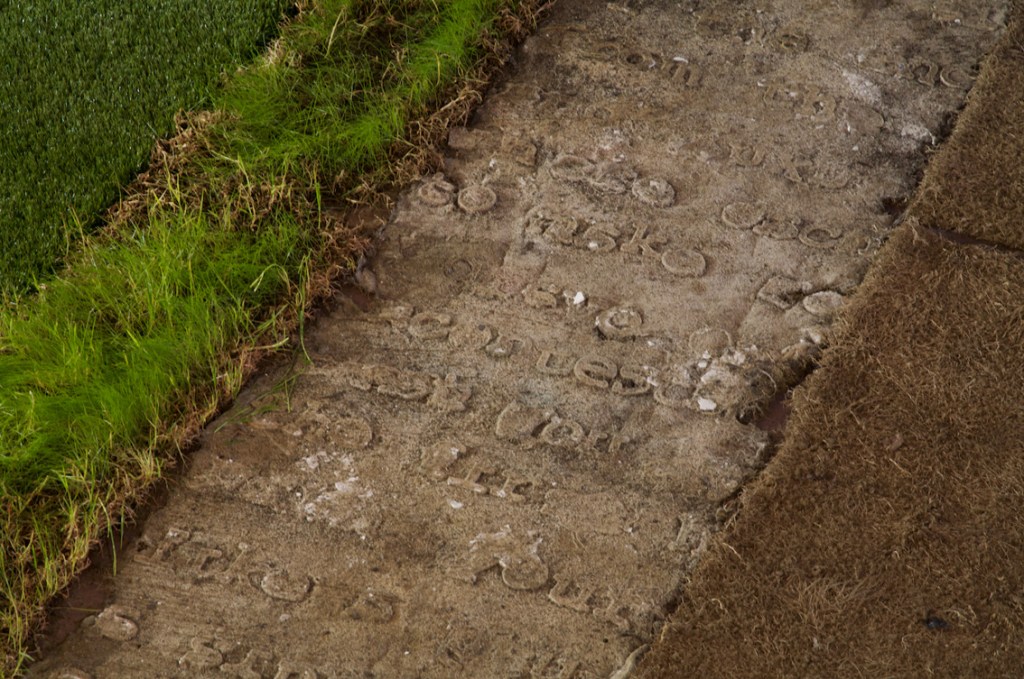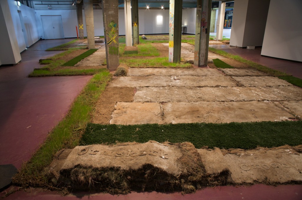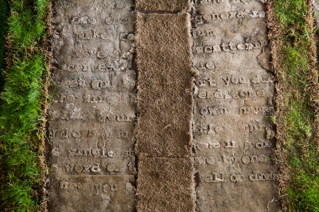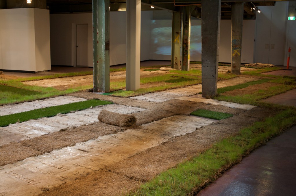 The texts were developed in collaboration with four writers on migration, whose texts I cast with the idea of language being transplanted: “When I made Liverpool / Liverpool in the two venues of St Georges Hall in Liverpool, UK, and the Casula Powerhouse in the city of Liverpool, New South Wales, I used the words of writers on migration, Sarah Day, Nasrin Mahoutchi, Catherine Rey and Ouyang Yu, in one of the cast grass pieces I made for it. I wanted to bring the work into both a local and global context by the use of local place names from both cities, interspersed with the new words of these writers that are inscribing themselves on the surface of this country, in and upon its earth, now inscribed in and on my grass earth pieces, words usually transposed, transplanted, from elsewhere, and in effect attempt to show what links them these cities and how they each migrate into the other, are already in play in each other.” Excerpt from Elizabeth Day, ‘Interview with Nicholas Tsoutas’ in Elizabeth Day, Discontinued Narratives, 2017, book.
