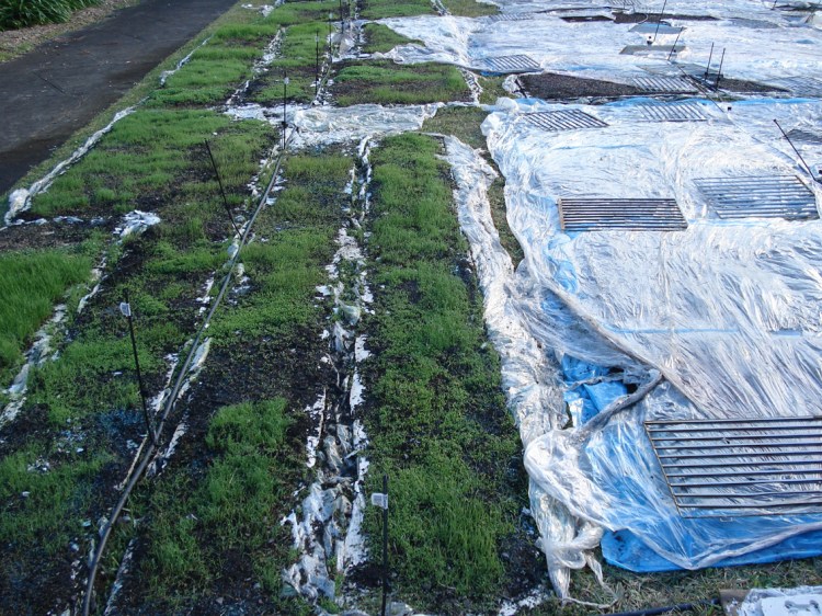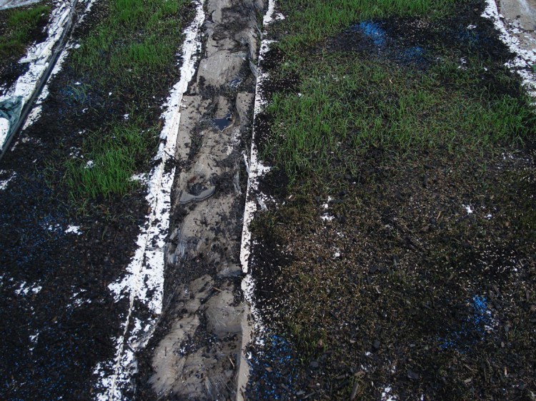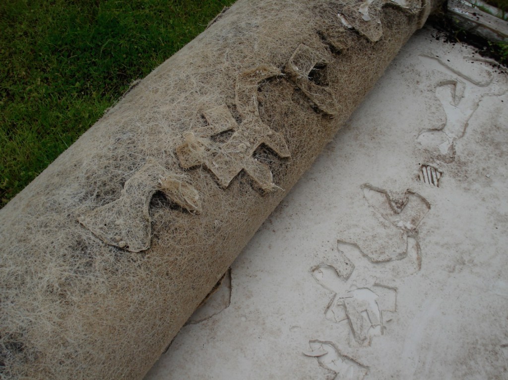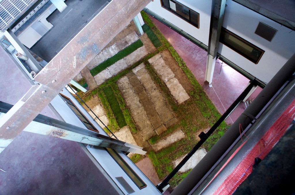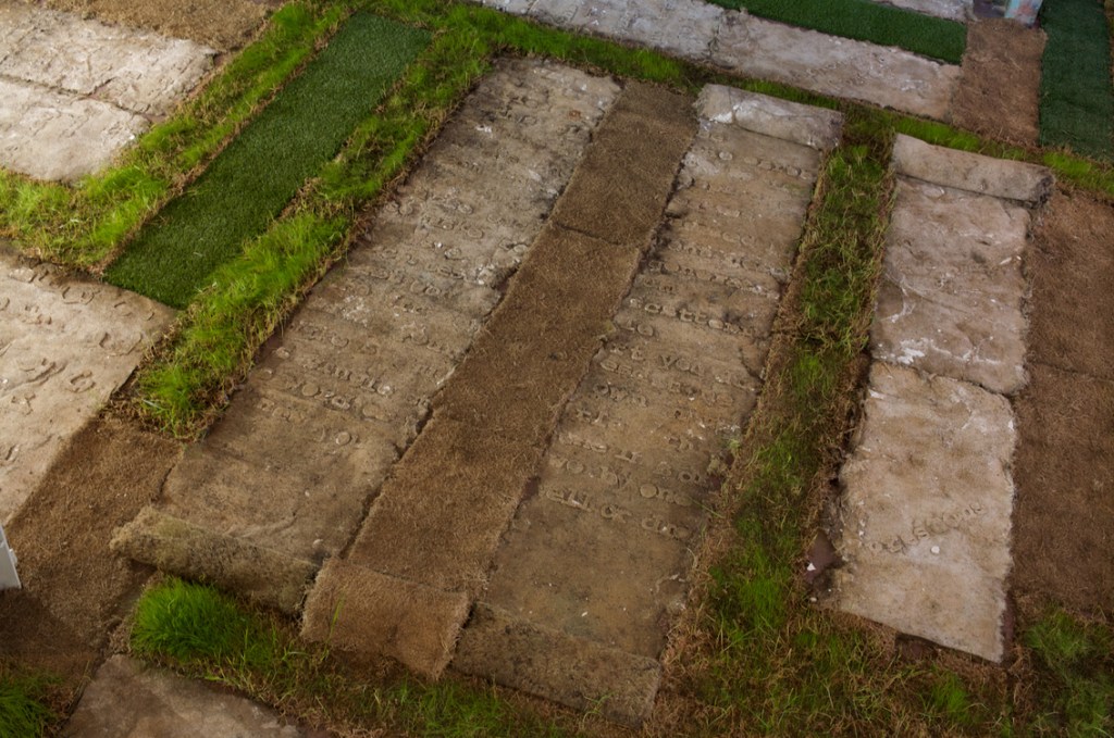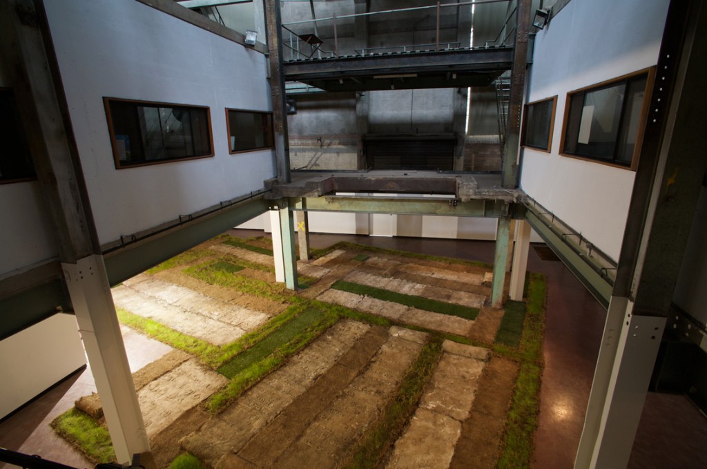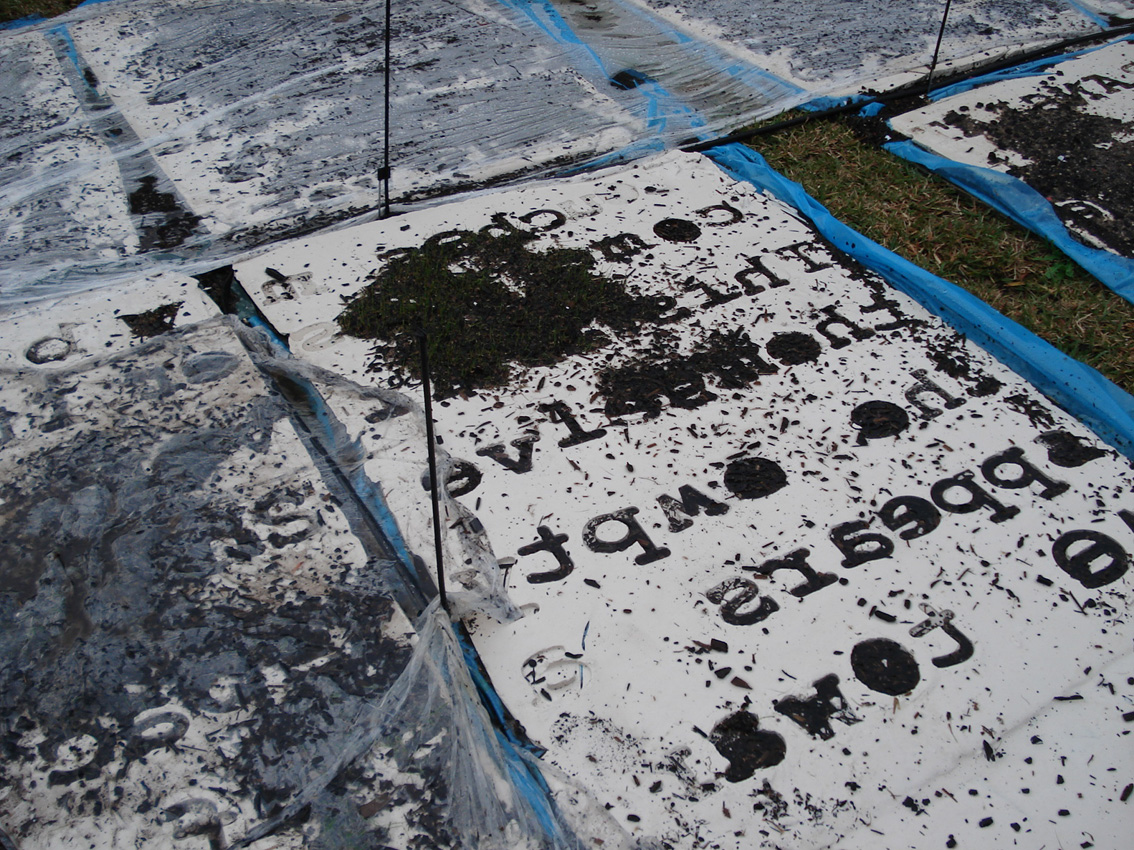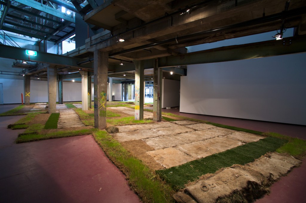 The texts were developed in collaboration with four writers on migration, whose texts I cast with the idea of language being transplanted: “When I made Liverpool / Liverpool in the two venues of St Georges Hall in Liverpool, UK, and the Casula Powerhouse in the city of Liverpool, New South Wales, I used the words of writers on migration, Sarah Day, Nasrin Mahoutchi, Catherine Rey and Ouyang Yu, in one of the cast grass pieces I made for it. I wanted to bring the work into both a local and global context by the use of local place names from both cities, interspersed with the new words of these writers that are inscribing themselves on the surface of this country, in and upon its earth, now inscribed in and on my grass earth pieces, words usually transposed, transplanted, from elsewhere, and in effect attempt to show what links them these cities and how they each migrate into the other, are already in play in each other.” Excerpt from Elizabeth Day, ‘Interview with Nicholas Tsoutas’ in Elizabeth Day, Discontinued Narratives, 2017, book.