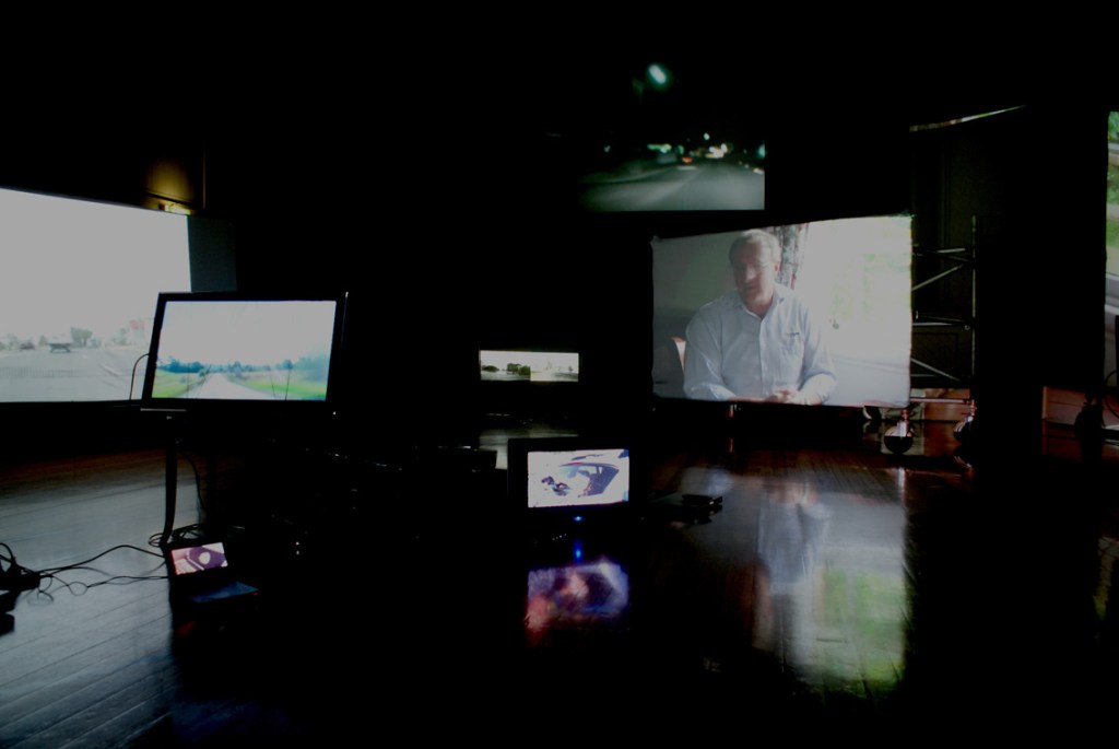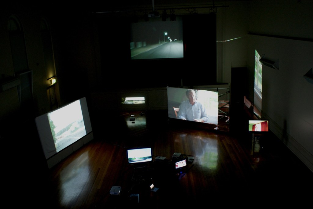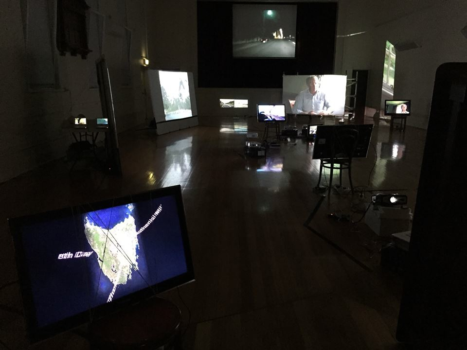 The work in this exhibition came out of residencies when the group (Elizabeth Day, Anna Gibbs, Julie Gough and Noelene Lucas) started to meet and work with some of the community of Longford, and to produce works that reflected their diasporic connections to the town. The images were projected onto items that were found in the hall including scaffolding and old furniture. The exhibition showed films, interviews and explorations of the town and its residents (some of whom have geneaological links to the Longford Project).