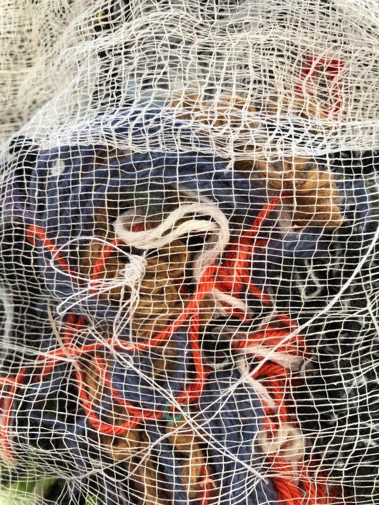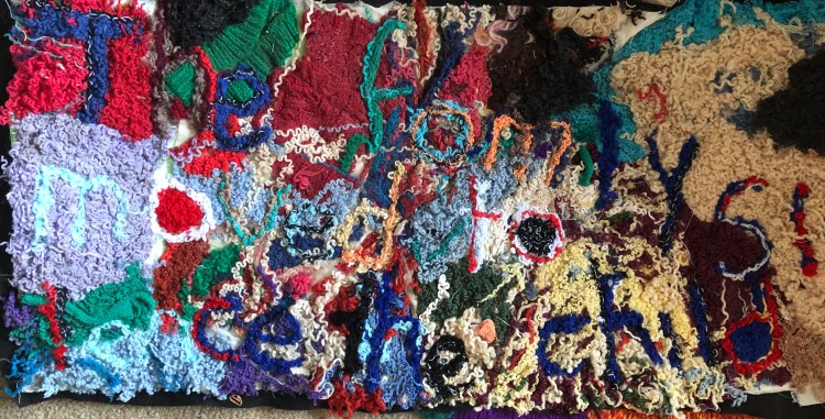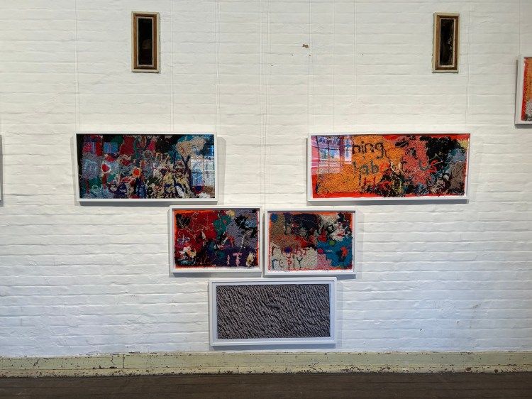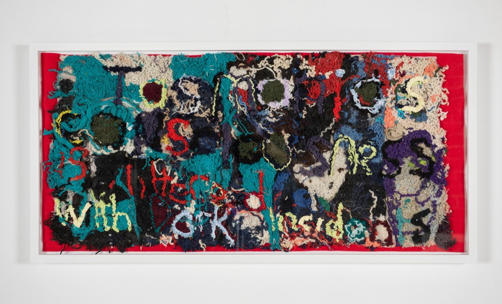 Elizabeth Day, Invisible Words Invisible Worlds: Tasmania’s consciousness is littered with dark incidents, 2020, unravelled wool, stitching, felt, framed, dimensions 45 x 100 cm.