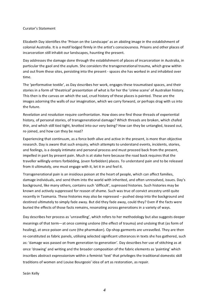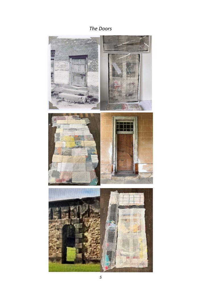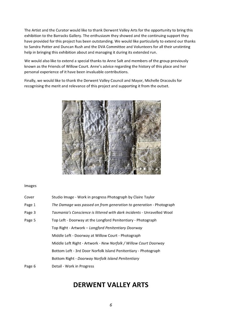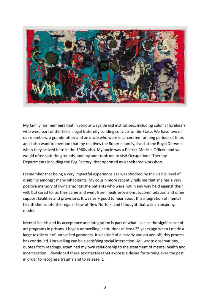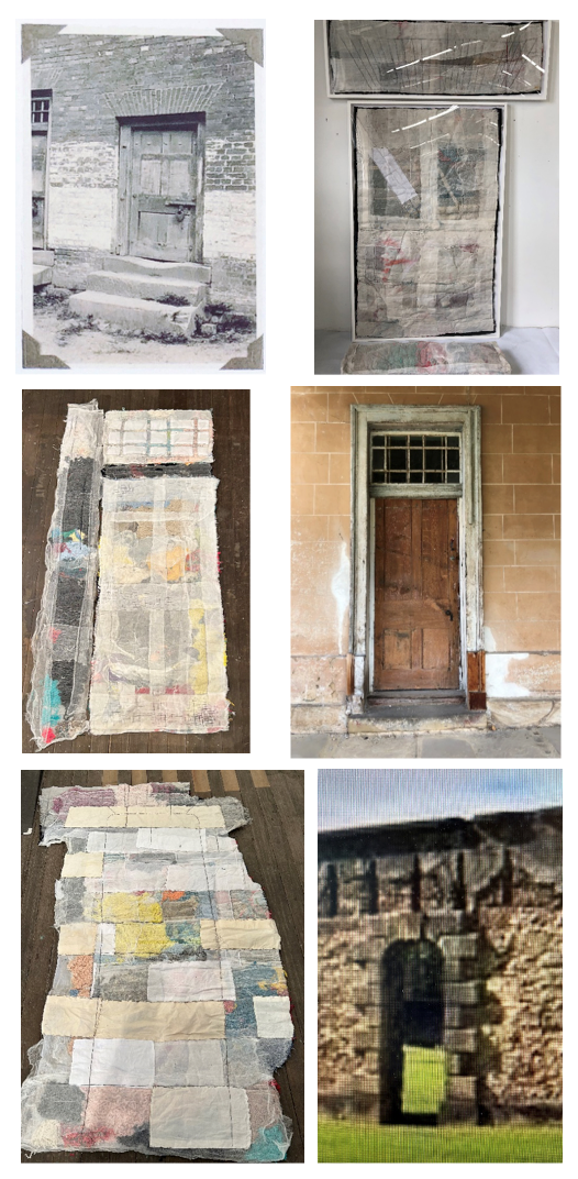 Slide 1: Elizabeth Day, drawing of Norfolk Island Penitentiary door, 2023, unravelled wool, muslin, stitching, c. 250 x 150 x 4 cm. Slide 2: Elizabeth Day, New Norfolk Asylum door at Willow Court, 2023, unravelled wool, muslin, stitching, c. 300 x 100 x 4 cm. Slide 3: Elizabeth Day, Obsolete 1827 Longford Gaol door (Norfolk Plains), 2021-2022, unravelled wool, muslin, stitching, 3 pieces (2 framed), dimensions variable. Note: When Norfolk Island was disbanded in 1806 occupants went to Norfolk Plains (Longford) and New Norfolk, both in about 1827.