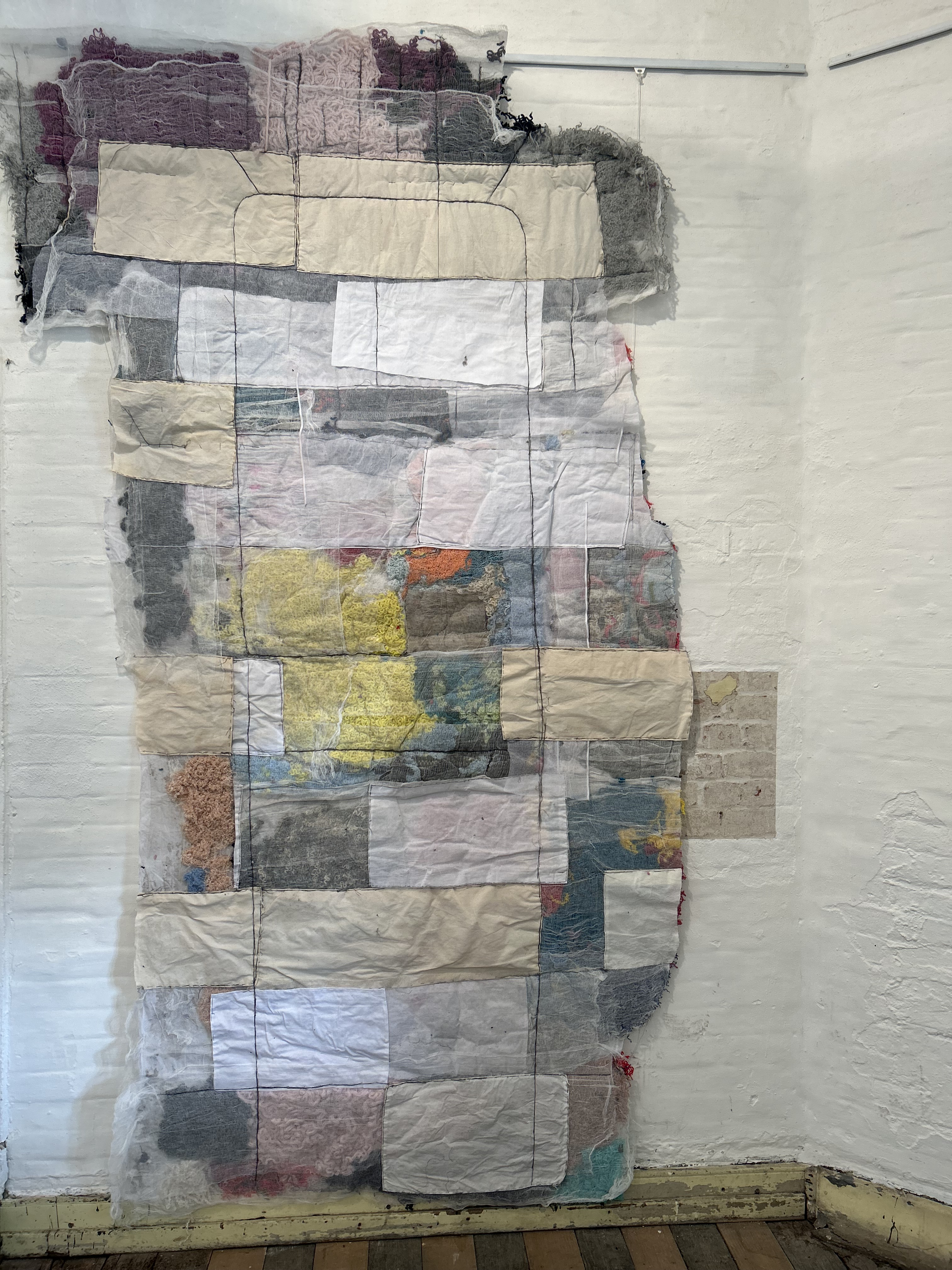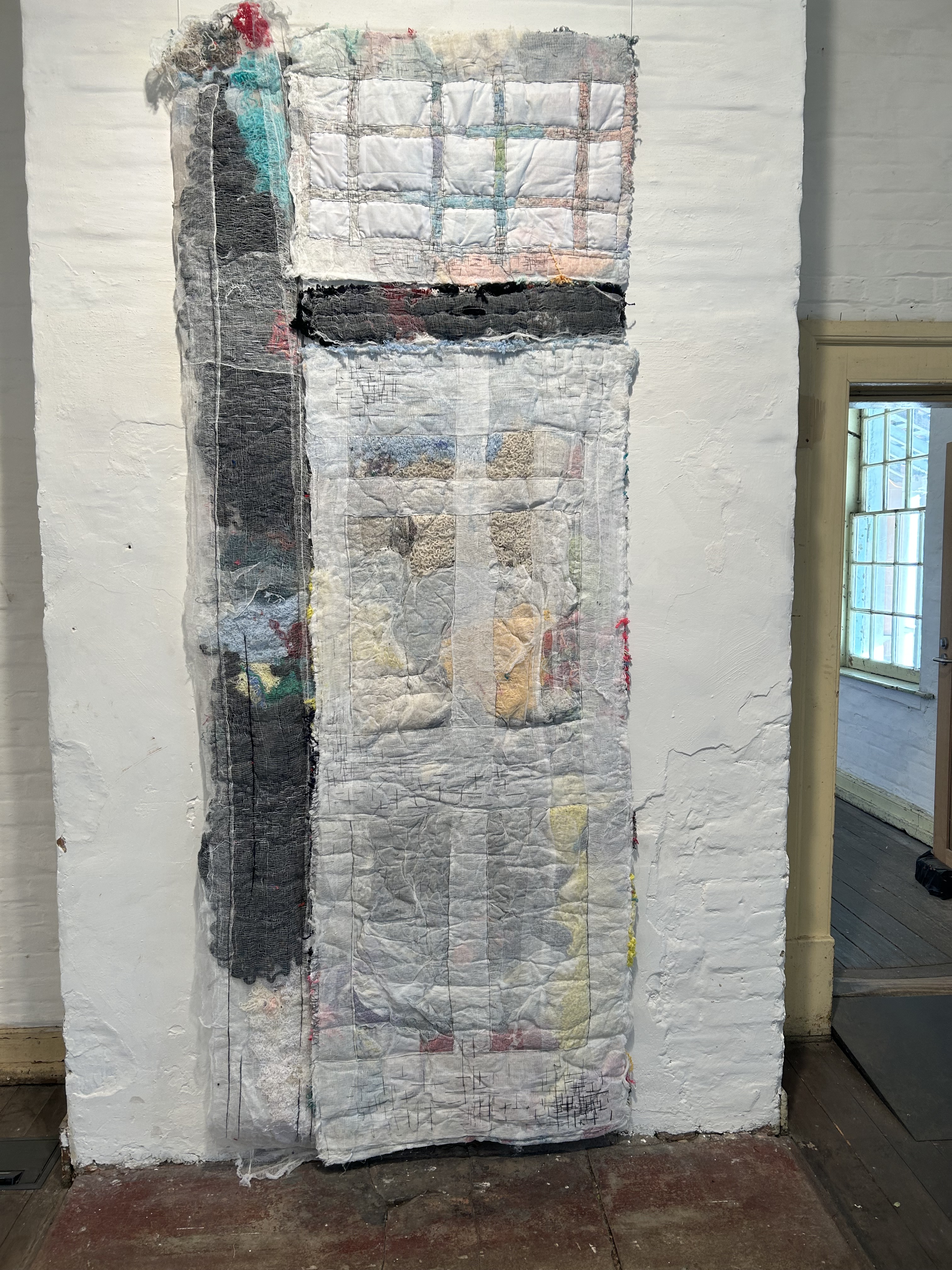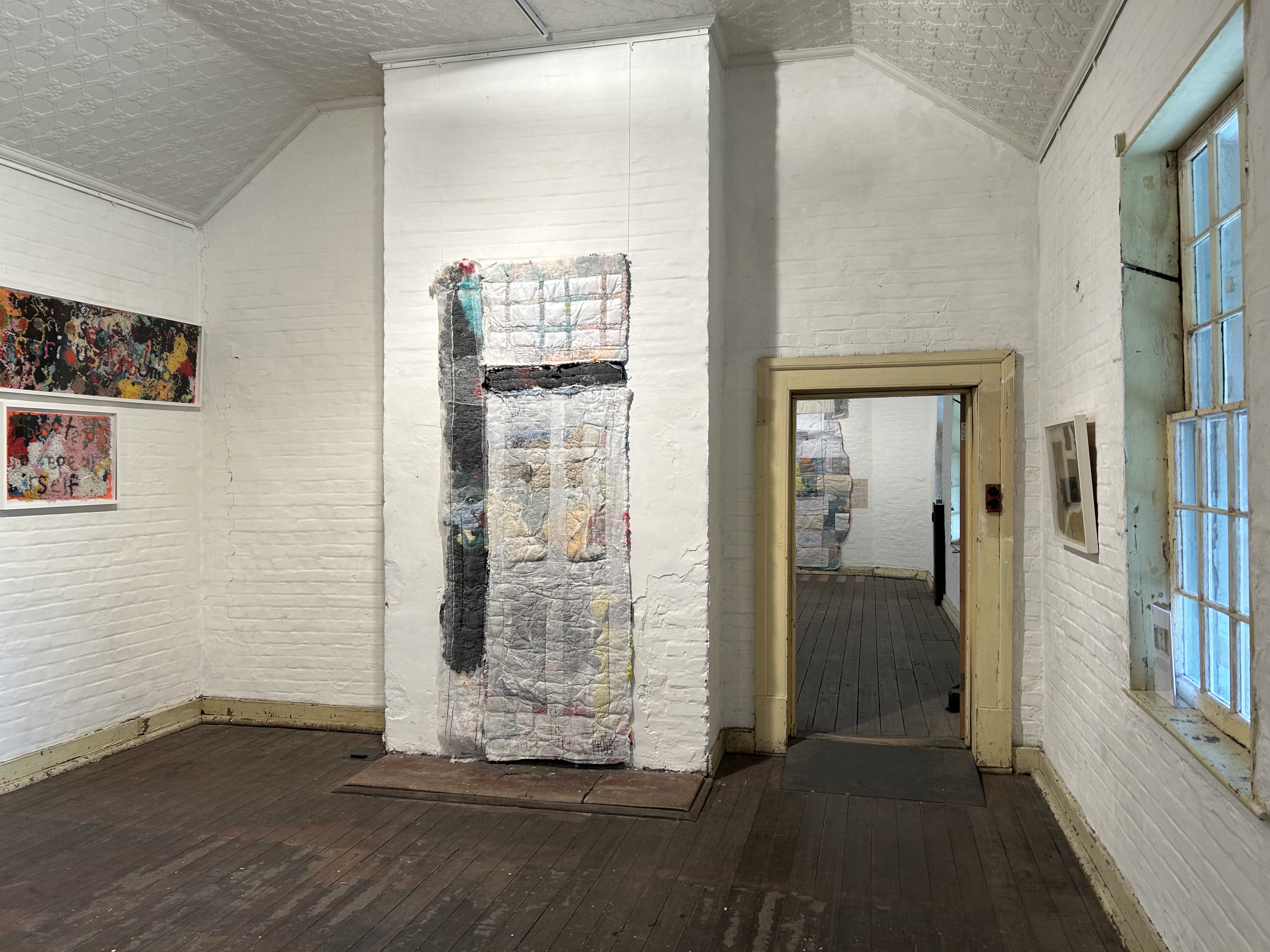 Slide 1: Elizabeth Day, drawing of Norfolk Island Penitentiary door, 2023, unravelled wool, muslin, stitching, c. 250 x 150 x 4 cm. Slide 2: Elizabeth Day, New Norfolk Asylum door at Willow Court, 2023, unravelled wool, muslin, stitching, c. 300 x 100 x 4 cm. Slide 3: Elizabeth Day, Obsolete 1827 Longford Gaol door (Norfolk Plains), 2021-2022, unravelled wool, muslin, stitching, 3 pieces (2 framed), dimensions variable. Note: When Norfolk Island was disbanded in 1806 occupants went to Norfolk Plains (Longford) and New Norfolk, both in about 1827.