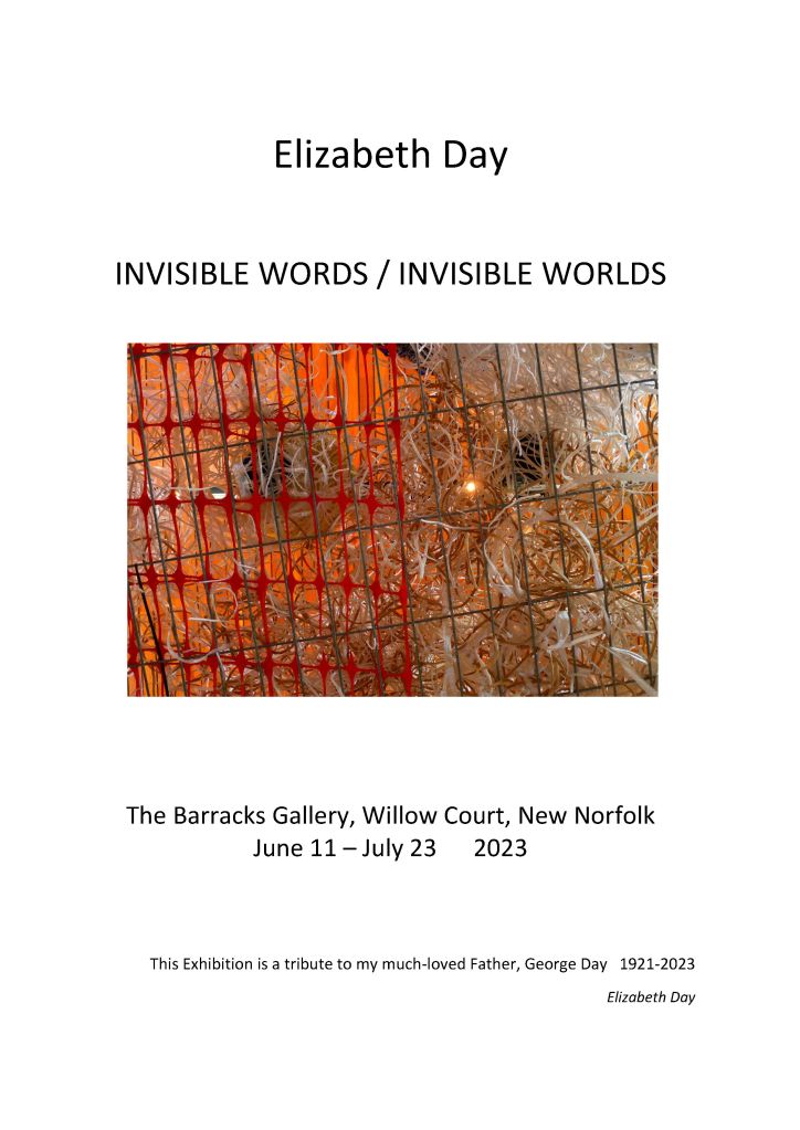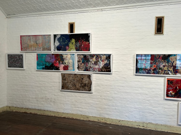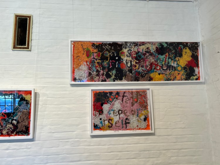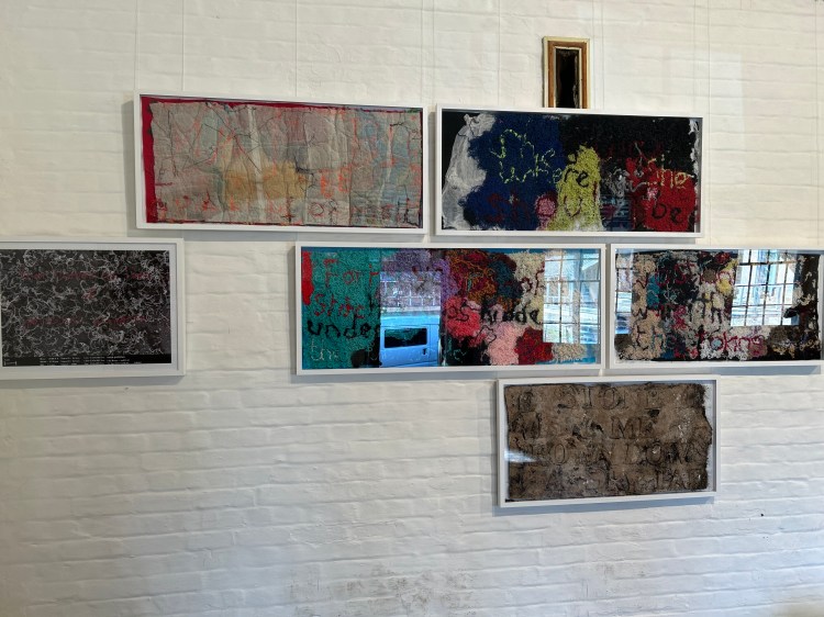 Elizabeth Day, Installation view at The Barracks Gallery of other framed digital prints from the series Invisible Words Invisible Worlds, 2016-2017, altered electron microscope imaging of nanotubes (this project was developed during a residency with the Centre for Organic Electronics, University of Newcastle, 2014-2017, and supported by an Australia Council Career Development Grant); and framed works from the series Unravelling of Form: Invisible Words Invisible Worlds, 2017-2023, unravelled wool, muslin, felt, dimensions variable. Includes detail of Invisible Words Invisible Worlds: The family moved to silence the child.