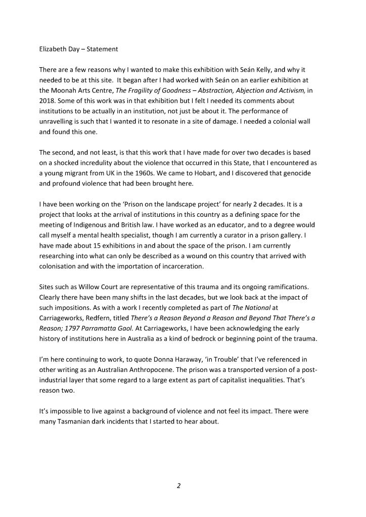 Solo exhibition at The Barracks Arts Centre / Willow Court (former asylum and hospital), New Norfolk, curated by Sean Kelly, June 11 – July 23 2023